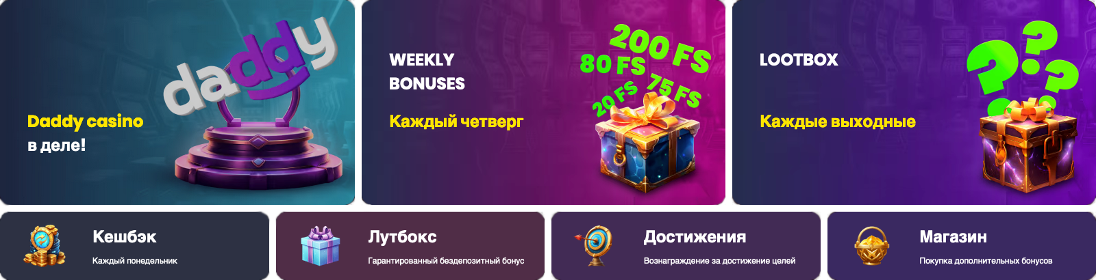Daddy казино привлекает посетителей наличием лицензии, частым проведением турниров, программой лояльности и слотами с возможностью покупки бонусных опций. Создайте профиль в клубе, внесите депозит и начните делать ставки прямо сейчас.
